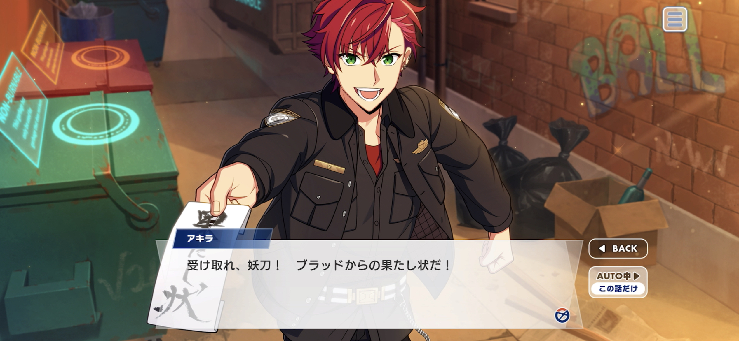 Akira: Take it, enchanted sword! It's a challenge letter from Brad!